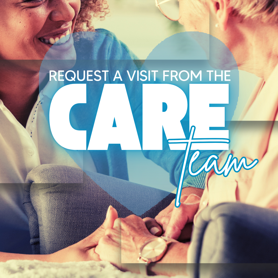 If you or a loved one is in need of a visit from our Care Ministry team, please follow the link below to submit a visit request. Whether it's in the hospital, a rehab/nursing home, or at home, we would love to come for a few minutes to share the love, comfort, and encouragement of Jesus.